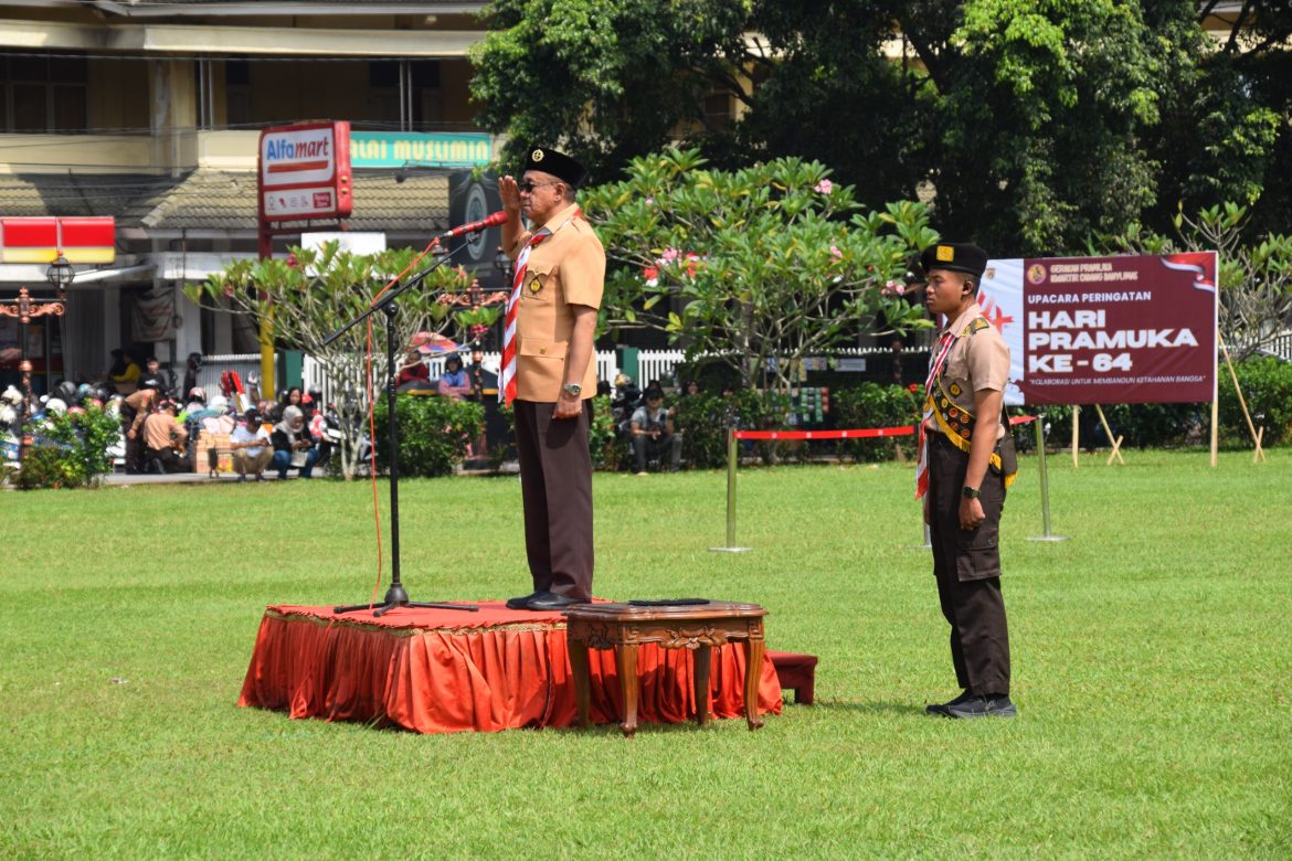 Purwokerto, betah.co.id – Gerakan Pramuka Kwartir Cabang Banyumas menggelar Upacara Hari Pramuka ke-64 Tingkat Kwarcab Banyumas, Sabtu (20/09/2025) di Alun-alun Purwokerto. Upacara dipimpin oleh Bupati Banyumas Sadewo Tri Lastiono selaku Ketua Majelis Pembimbing Cabang (Mabicab), diikuti sekitar 3000 anggota Pramuka dari berbagai golongan dengan pengibar bendera dari Pasukan Tunas Muda Kwarcab Banyumas. Hadir dalam kegiatan Ketua Kwarda Jawa Tengah Slamet Budi Prayitno, Perwakilan Forkompimda, Wakil Bupati Dwi Asih Lintarti dan undangan lainya.