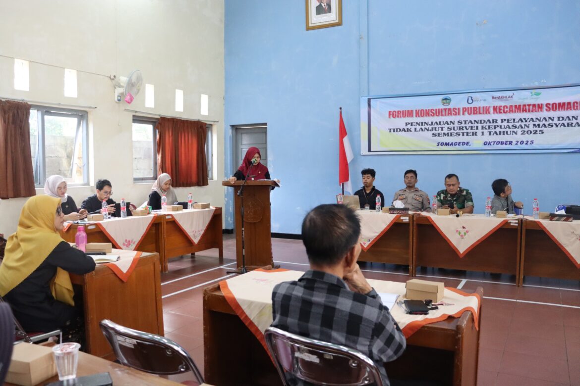 Somagede, betah.co.id – Dalam upaya meningkatkan kualitas pelayanan publik, Kecamatan Somagede menggelar Forum Konsultasi Publik (FKP) yang berlangsung di Aula Korwilcam Dindik Somagede pada Kamis (16/10). Kegiatan ini menjadi momentum penting untuk meninjau kembali Standar Pelayanan dan menindaklanjuti hasil Survei Kepuasan Masyarakat (SKM) Semester I tahun 2025.